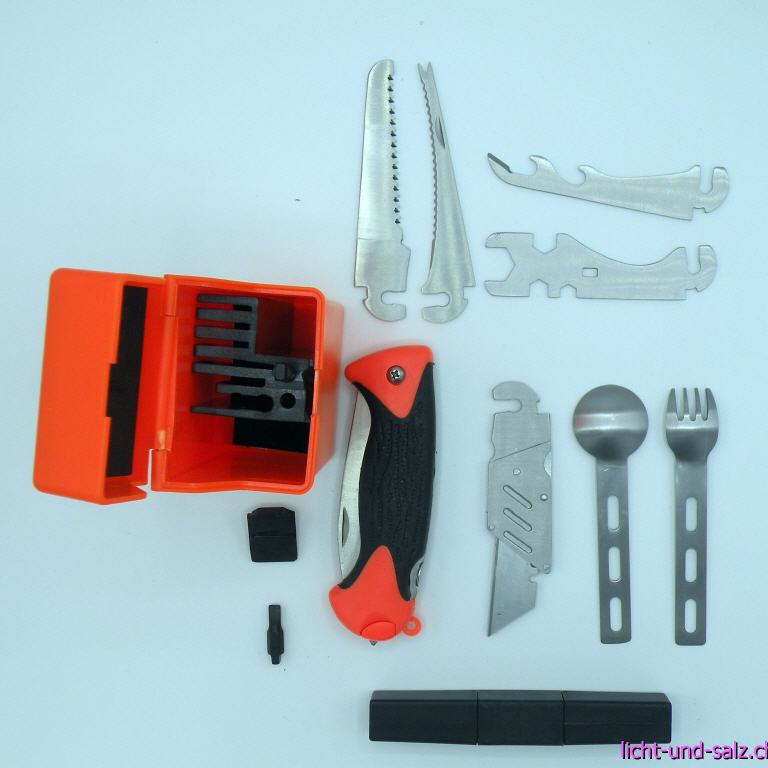 Überlebensset Survival Kit mit Klappmesser in Kunststoffbox 33 Einzelteile. Hersteller: Storfisk fishing & more Dieses umfangreiche Survival Kit beinhaltet 33 Teile, welche das Überleben in Notfallsituationen erheblich erleichtern. Alle Einzelteile werden sehr kompakt und platzsparend in einer Kunststoffbox mit Gürtelhalterung geliefert. Dank der auffälligen Farbe in Signalorange ist das Überlebensset immer gut sichtbar und geht nicht so leicht verloren. Das Klappmesser verfügt über eine Feststellfunktion, welche die (gegen die mitgelieferten Aufsätze austauschbare) Klinge in Position hält. Packmaß 13,5 cm x 7 cm x 5 cm. Lieferumfang Kunststoffbox (schwarz) Gabel Löffel Bit (Kreuzschlitz) Bit (Schlitz) 2 Heftpflaster Pinzette 2 Streichhölzer + Anzündpapier Skalpell Sicherheitsnadel 2 Nähnadeln Nähfaden 2 Angelhaken 2 Bleie Angelschnur Bleistift 2 Papiere Spiegelfolie Kunststoffbox mit Gürtelhalter (signalorange) Klappmesser mit wechselbarer Klinge Sägeaufsatz Fisch-Schabemesser Dosen- bzw. Flaschenöffner Schraubenschlüssel Cuttermesser Feile Schere · Survival Kit 33-tlg. für Outdoor und Notfallsituationen · Lieferung in praktischer Kunststoffbox mit Gürtelhalter in Signalorange · Klappmesser mit wechselbarer Klinge (austauschbar gegen mitgeliefertes Zubehör) · Essbesteck, Nähset, Angelset, Stift mit Papier, diverse Werkzeuge · Erleichtert das Überleben in Notfallsituationen.